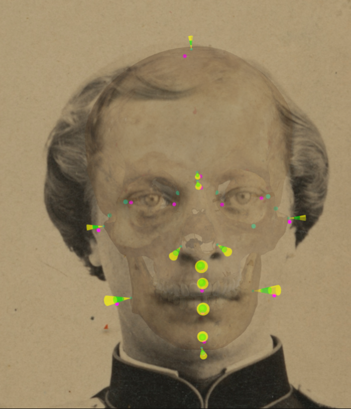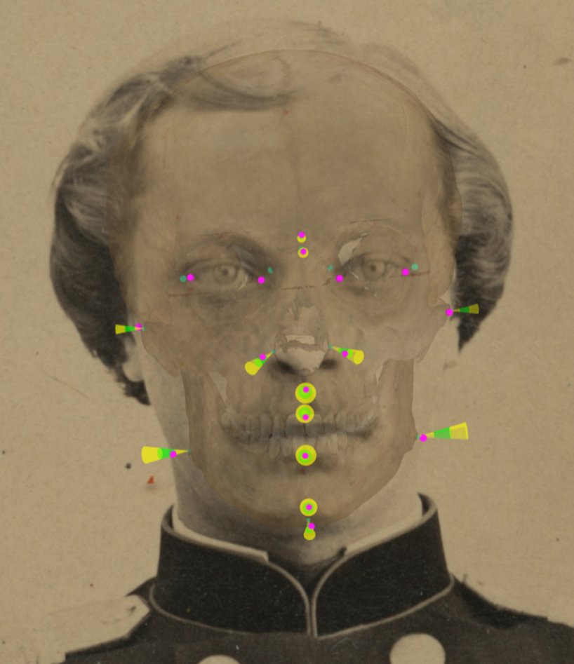 Figura 1. Visualización y análisis de la consistencia del tejido blando mediante conos con Skeleton-ID en un solapamiento positivo. Para cada punto cefalométrico (magenta), se visualiza la región del cono del punto craneométrico homólogo en la que se localiza dentro del rango definido en el estudio de tejido. Podemos ver cómo, en la franja verde, el tejido blando se encuentra entre la media ± la desviación estándar (n’ – n, al’ L – al L, al’ R – al R, sn’ – ss, ls’ – pr, li’ – id, pg’ – pg, gn’ – gn). En la franja amarilla, dentro de la media más tres veces la desviación estándar (g’ – g) y debajo de la media menos tres veces la desviación estándar (zy’ L – zy L, zy’ R – zy R, go’ L – go L, go’ R – go R). Las parejas en’ – d y ex’ – ec no se han analizado debido a la ausencia de datos estadísticos disponibles.